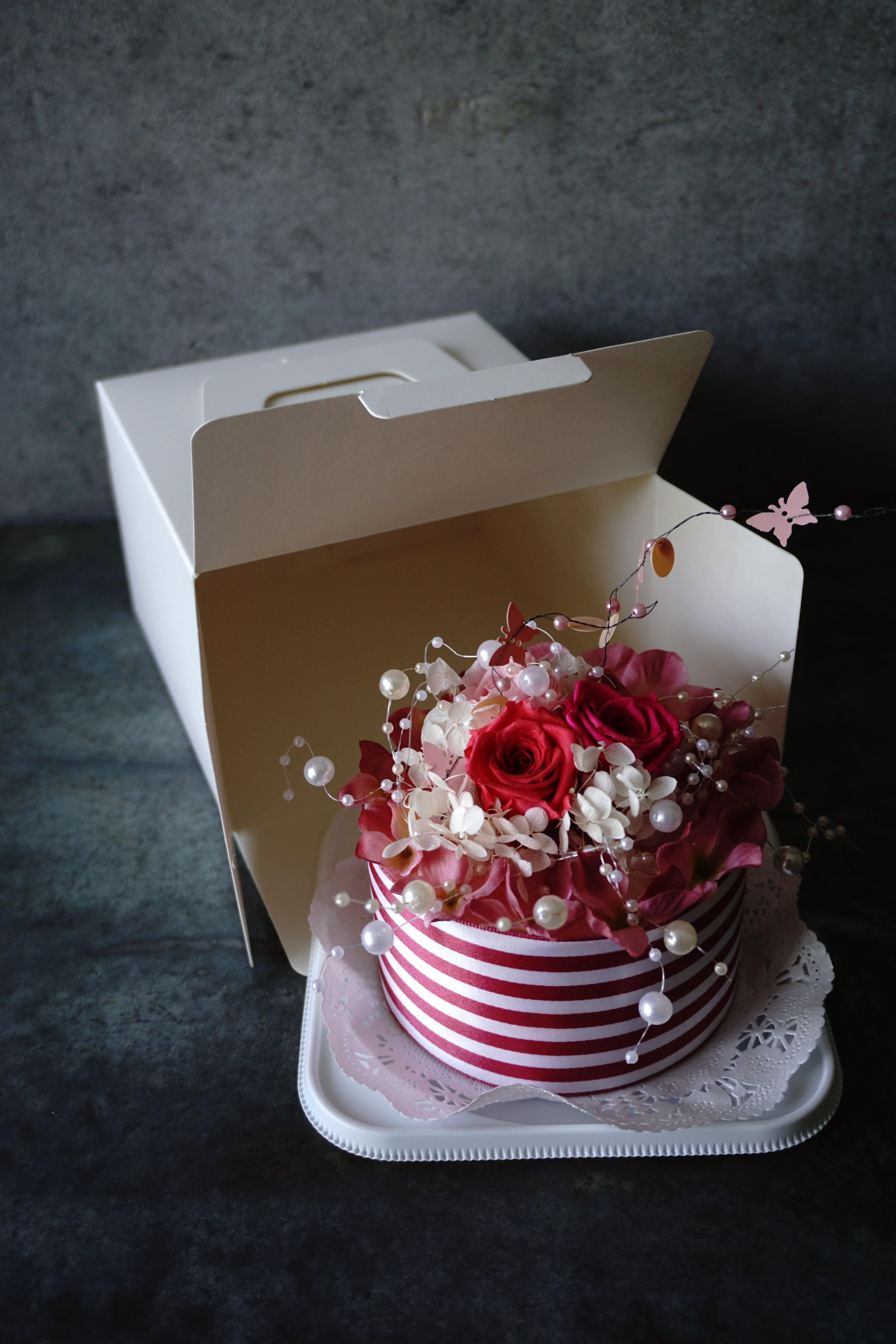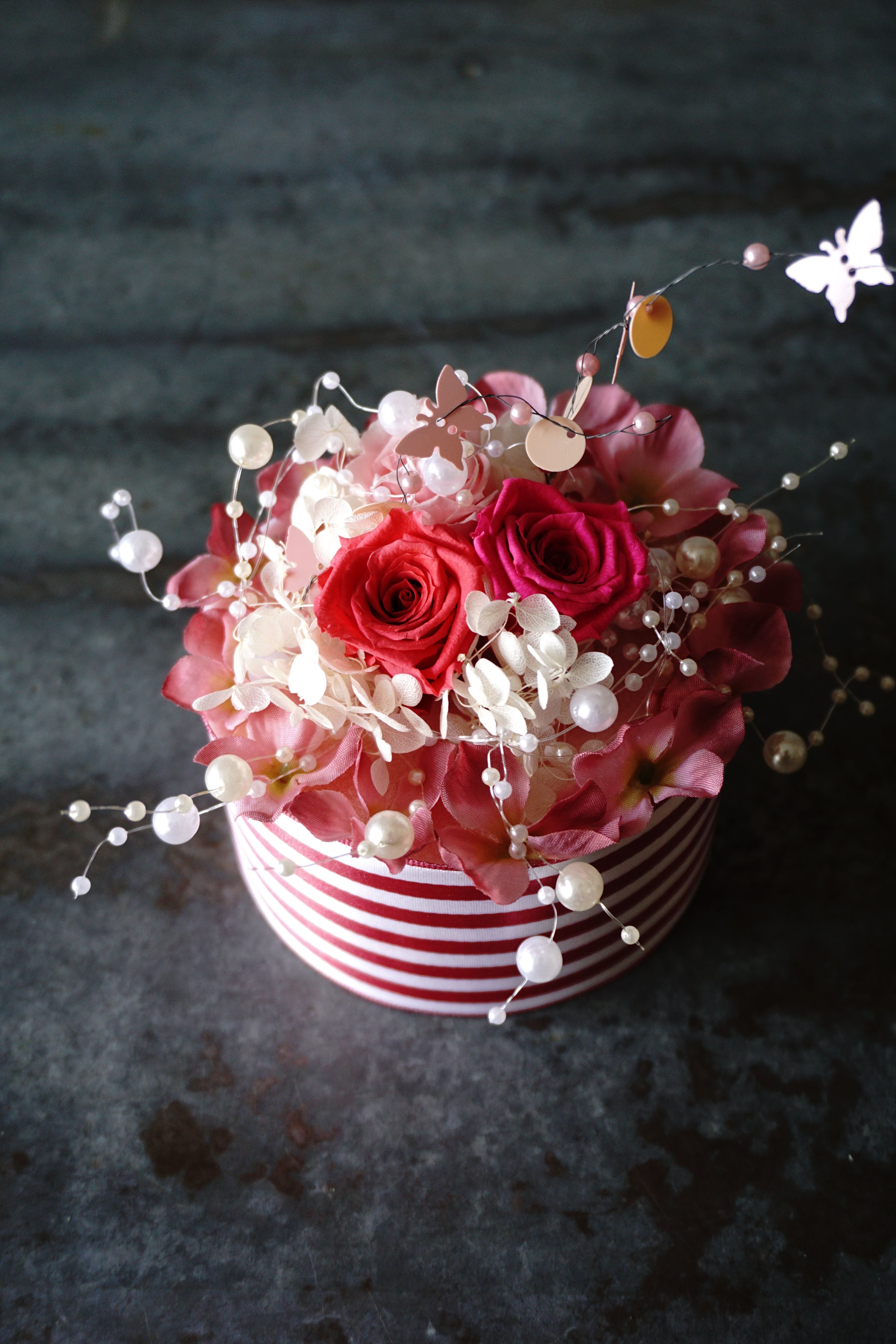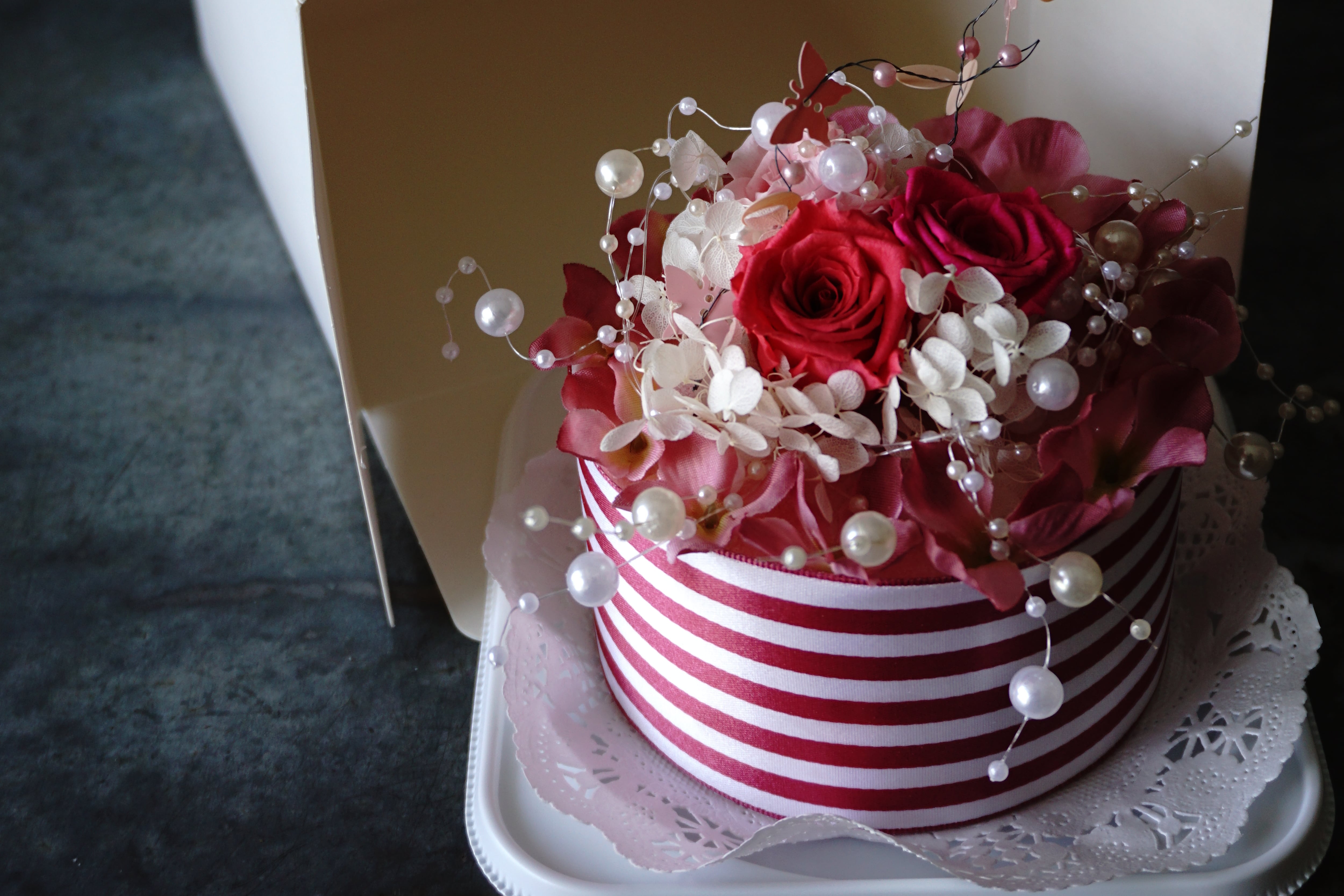 可愛らしいイチゴケーキをイメージした、このプリザーブドフラワーは特別な時を演出します!